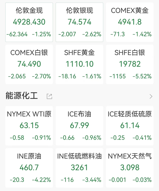 银矿股赫克拉矿业、科尔黛伦矿业、Silvercorp Metals、Endeavour Silver均跌超3%;金矿股Sibanye Stillwater跌近6%,哈莫尼黄金跌超4%,纽蒙特下跌3%。